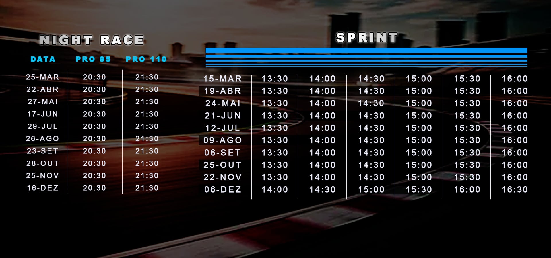 Calendário 2026 Acompanhe o calendário completo, com as etapas da Liga do Kart Sprint e da Liga do Kart Night Race na temporada 2026.